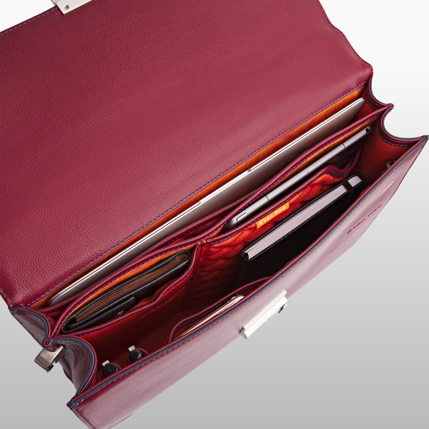 The Amsterdam Briefcase fits a MacBook 13" / 14", iPad, notepad, and daily essentials with 13 smart interior pockets. Larger laptops (up to 15.6") fit in the main compartment, but not the padded section. Includes a removable 3cm (1.18") wide strap.
