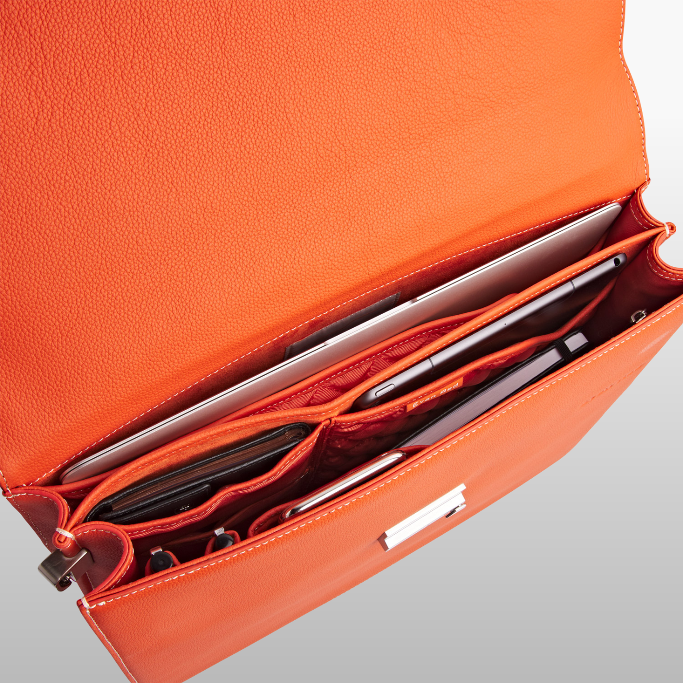 The Amsterdam Briefcase fits a MacBook 13" / 14", iPad, notepad, and daily essentials with 13 smart interior pockets. Larger laptops (up to 15.6") fit in the main compartment, but not the padded section. Includes a removable 3cm (1.18") wide strap.