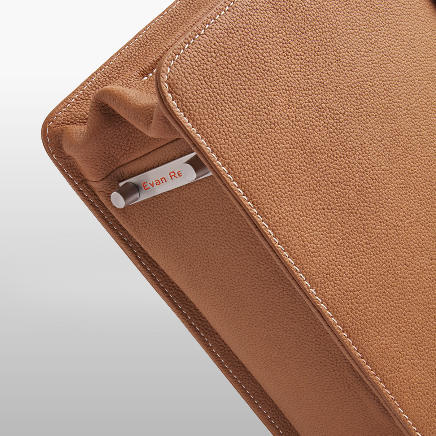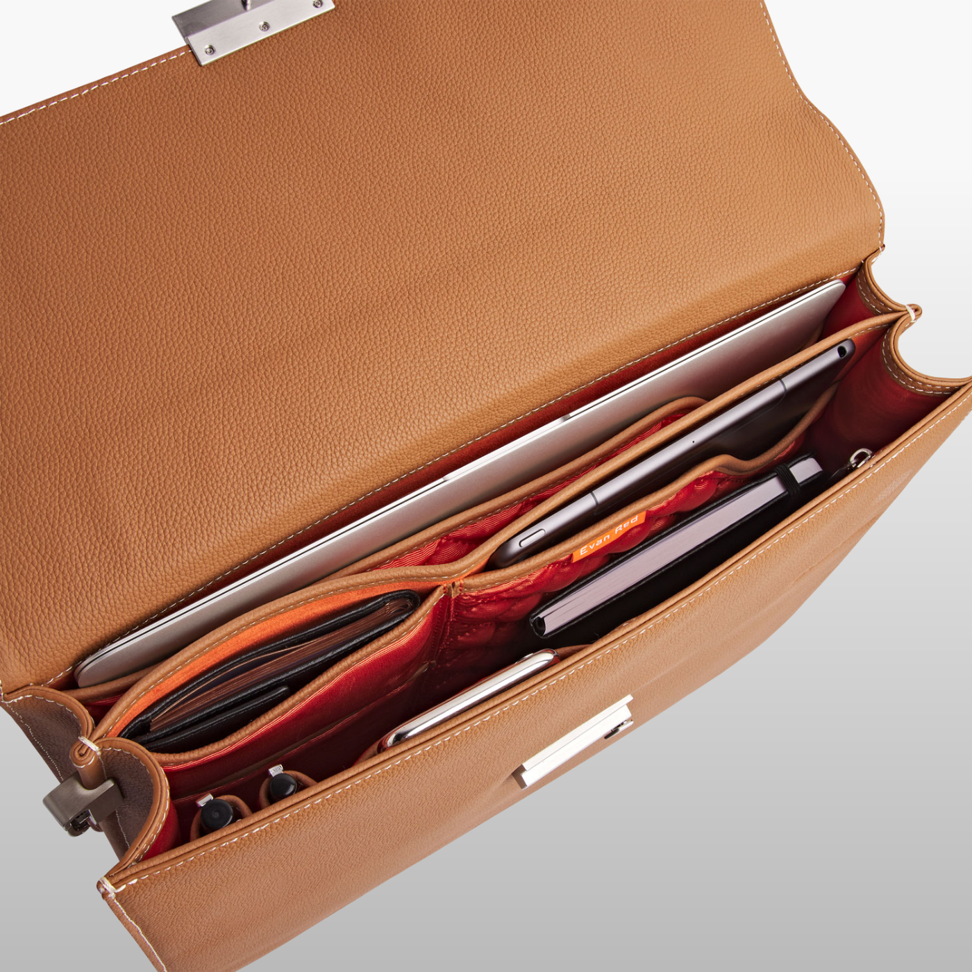 The Amsterdam Briefcase fits a MacBook 13" / 14", iPad, notepad, and daily essentials with 13 smart interior pockets. Larger laptops (up to 15.6") fit in the main compartment, but not the padded section. Includes a removable 3cm (1.18") wide strap.