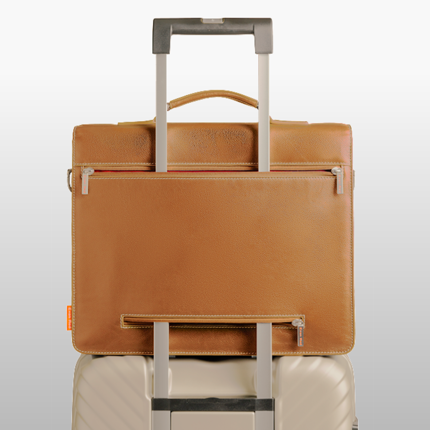 The Amsterdam briefcase features a dual-zip luggage sleeve, allowing you to effortlessly secure it to your trolley