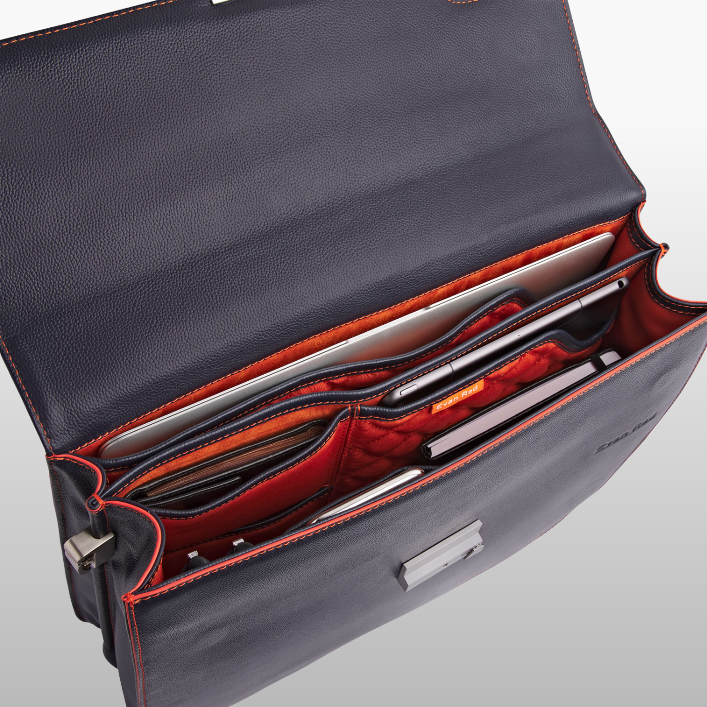The Amsterdam Briefcase fits a MacBook 13" / 14", iPad, notepad, and daily essentials with 13 smart interior pockets. Larger laptops (up to 15.6") fit in the main compartment, but not the padded section. Includes a removable 3cm (1.18") wide strap.