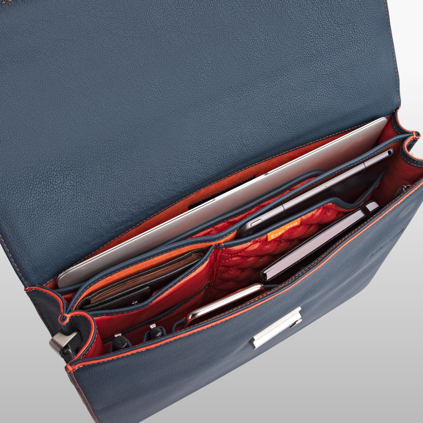La valigetta Amsterdam è adatta a un MacBook da 13"/14", iPad, blocco note e oggetti essenziali per l'uso quotidiano, con 13 pratiche tasche interne. I laptop più grandi (fino a 15,6") trovano posto nello scomparto principale, ma non nella sezione imbottita. Include una tracolla rimovibile larga 3 cm (1,18").
